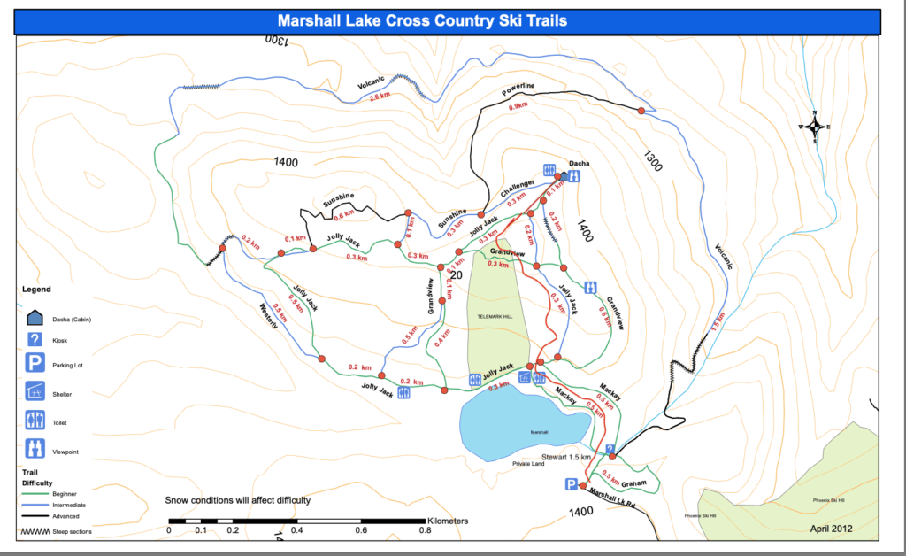 The Marshall Lake trail system now features three dedicated snowshoe trails, all clearly marked on the map below.